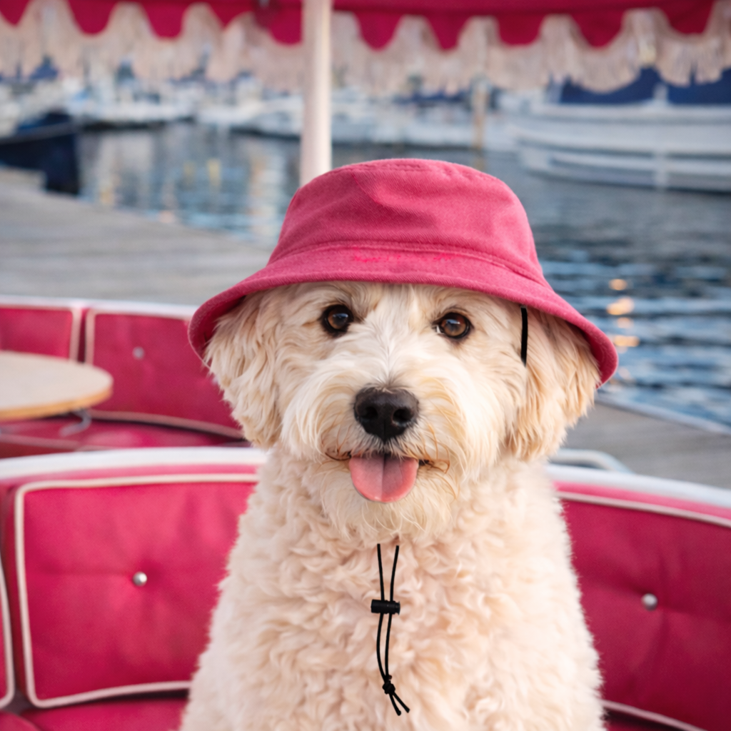 Rosé All Day - a soft, sun-washed pink that feels equal parts playful and polished. Designed in a relaxed bucket silhouette, this lightweight hat sits comfortably on your dog’s head while offering easy shade for warm, sunny days. Finished with a clean, minimal look that pairs perfectly with pool decks, marina strolls, and weekend getaways, it’s effortless style with a vacation-state-of-mind attitude.