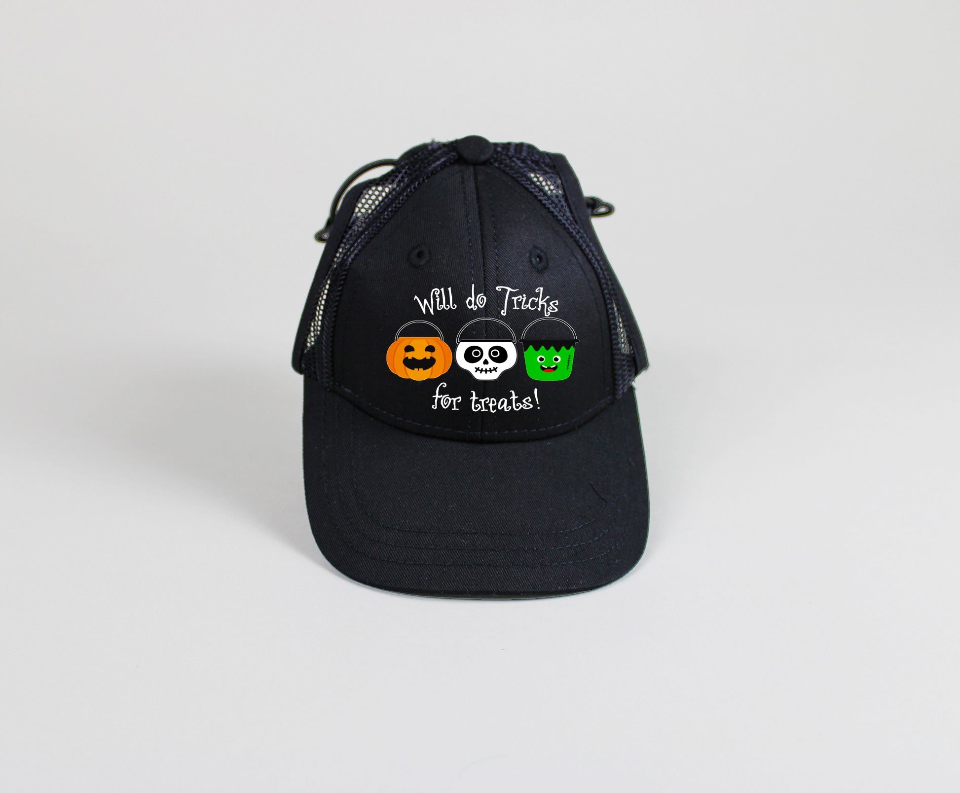 “Will Do Tricks for Treats” Dog Baseball Cap - Your pup will steal the spotlight this Halloween with our black dog baseball cap that says it all: “Will Do Tricks for Treats.” Complete with festive heat transfer graphics of pumpkin, monster, and skull-shaped Halloween buckets, this cap is the ultimate nod to the spooky season. Designed with comfort and fit in mind, it keeps your dog looking stylish while protecting their eyes on crisp autumn walks. Perfect for costume parties, trick-or-treating, or just showing off your pup’s playful spirit, this cap is a treat all on its own!