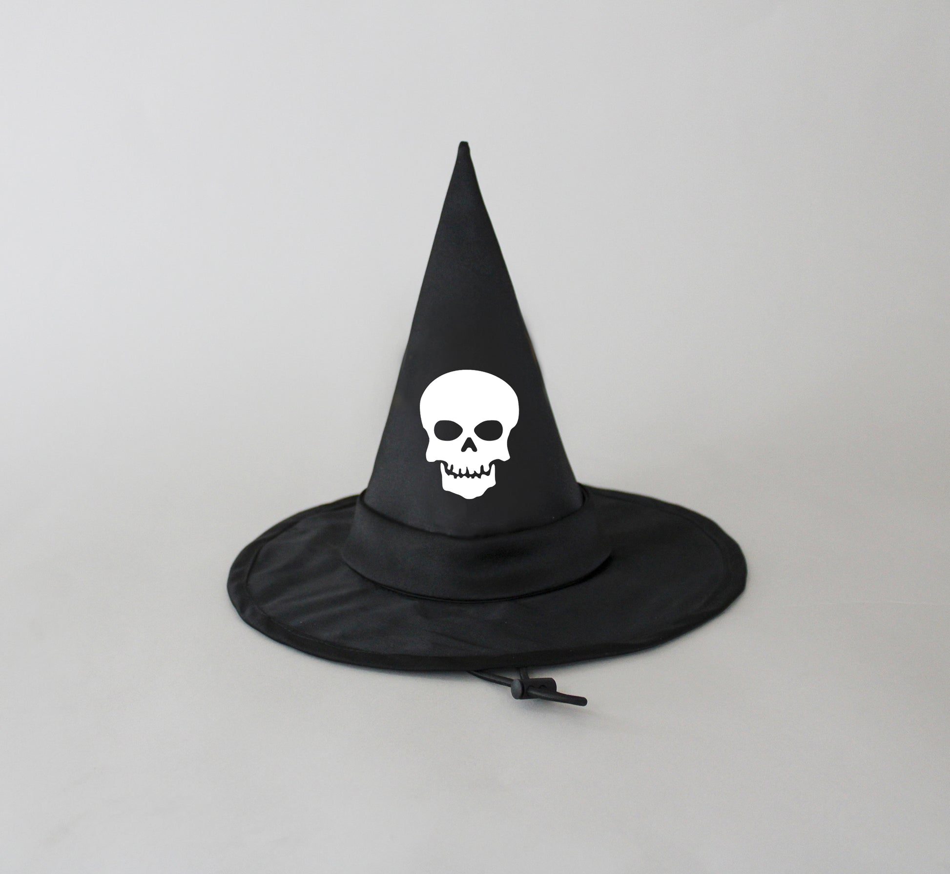 Turn up the spooky factor this Halloween with our Skull Face Witch Hat for dogs! Featuring a bold white skull heat transfer on deep black fabric, this hat is perfect for pups with a mischievous side. The elastic strap with adjustable cord lock keeps it comfy and secure, so your dog can strut through the neighborhood in hauntingly good style.